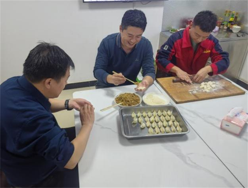 活動最后,黃樂同志和第四黨支部的黨員以及電站職工一起包了餃子,大家和面、調(diào)餡,分工有序,忙而不亂,一邊包著餃子,一邊還分享著自己包餃子的心得,大家邊說邊干,互相幫忙,活動現(xiàn)場熱鬧非凡。一盤盤餃子順利下鍋,大家一同坐下吃餃子,分享著勞動成果,熱騰騰的餃子吃在嘴里,暖在心頭,現(xiàn)場一片歡聲笑語、其樂融融。